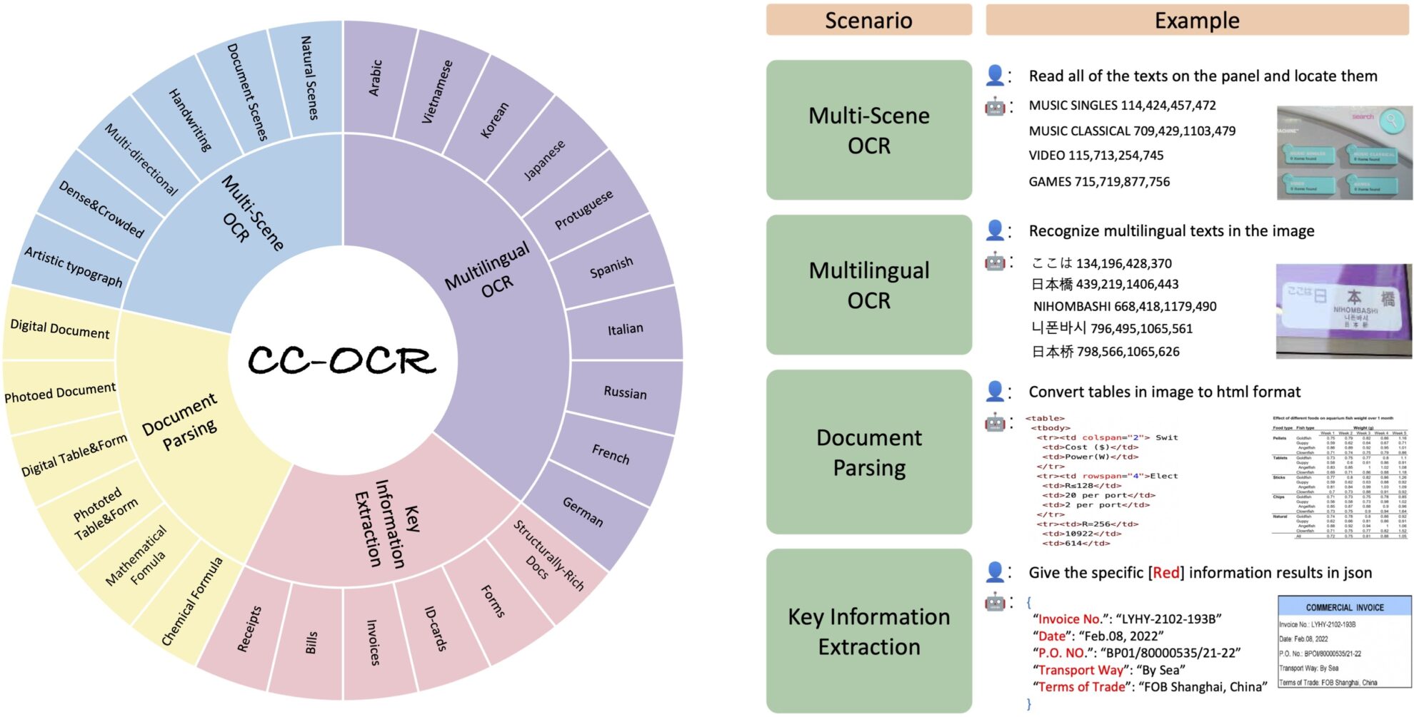 تغطي مجموعة البيانات أربع مهام أساسية: قراءة النصوص متعددة المشاهد، وقراءة النصوص متعددة اللغات، وتحليل المستندات، واستخراج المعلومات الرئيسية، وتحتوي على 39 مجموعة فرعية و7058 صورة موضحة بالكامل. ويساهم إطلاق CC-OCR في سد الفجوة في تقييم النماذج متعددة الوسائط الحالية في الهياكل المعقدة والتحديات البصرية الدقيقة، وهو أمر ذو أهمية كبيرة لتعزيز تقدم النماذج متعددة الوسائط في التطبيقات العملية.