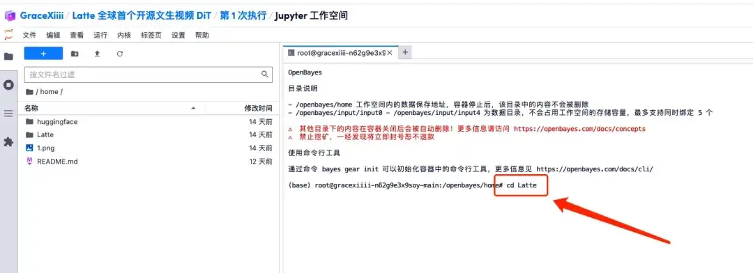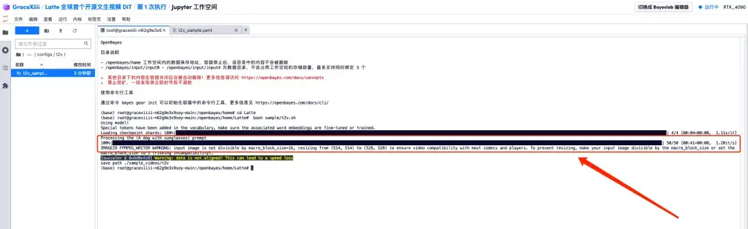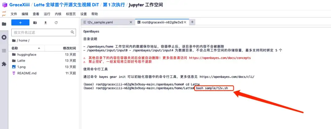 7. بعد الحفظ، قم بإنشاء صفحة طرفية جديدة، وأدخل "cd Latte" واضغط على Enter للدخول إلى دليل "Latte". أدخل "bash sample/t2v.sh" لتوليد فيديو عالي الدقة.