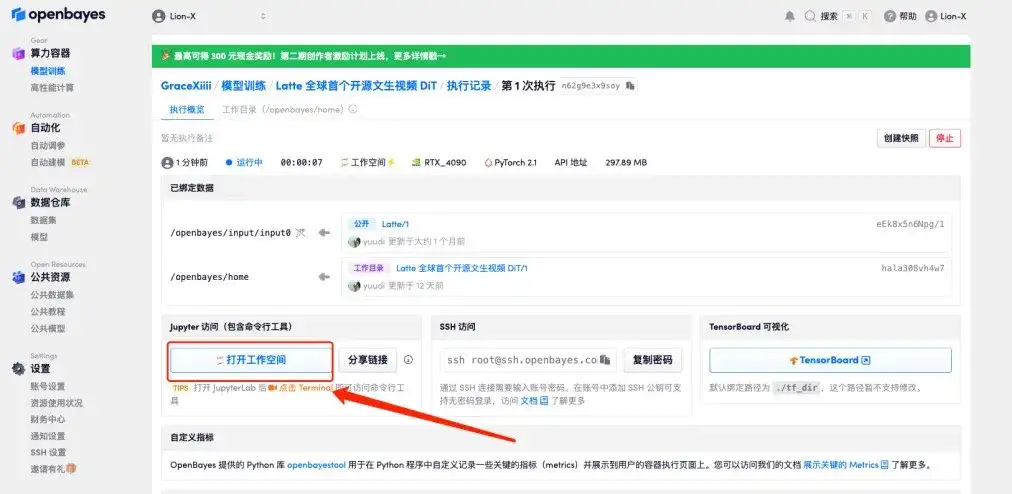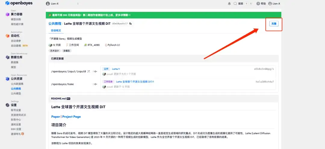 وفي هذا السياق، ومن أجل مساعدة المزيد من العاملين المبدعين وعشاق الفيديو على مواكبة اتجاه التكنولوجيا،أطلقت شركة HyperAI برنامج تعليمي بعنوان "أول فيديو Vincent Video DiT مفتوح المصدر في عالم Latte".لقد قام هذا البرنامج التعليمي ببناء بيئة لك. لم يعد عليك الانتظار حتى يتم تنزيل النموذج وتدريبه. ما عليك سوى النقر فوق "استنساخ" لبدء تشغيله بنقرة واحدة، وإدخال النص لتوليد مقطع فيديو على الفور!