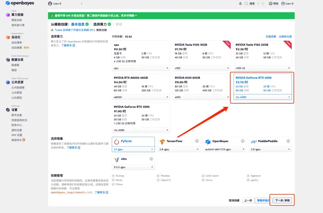 4. بعد القفزة، حدد "NVIDIA GeForce RTX 4090" وانقر فوق "التالي: المراجعة".يمكن للمستخدمين الجدد التسجيل باستخدام رابط الدعوة أدناه للحصول على 4 ساعات من RTX 4090 + 5 ساعات من وقت فراغ وحدة المعالجة المركزية!