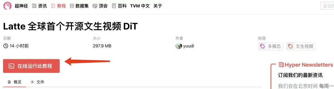 1. قم بتسجيل الدخول إلى hyper.ai، في صفحة "البرامج التعليمية"، حدد "Latte World's First Open Source Vinyl Video DiT"، وانقر فوق "تشغيل هذا البرنامج التعليمي عبر الإنترنت".