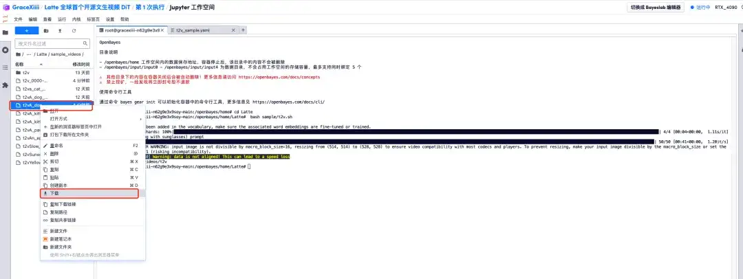 1. عندما يظهر شريط التقدم 100%، افتح شريط القائمة الأيسر "Latte/sample_videos"، وابحث عن الفيديو الذي أنشأناه، وانقر بزر الماوس الأيمن للتنزيل.يرجى ملاحظة أن مقاطع الفيديو بتنسيق MP4 لا يمكن مشاهدتها مباشرة ويجب تنزيلها قبل مشاهدتها.