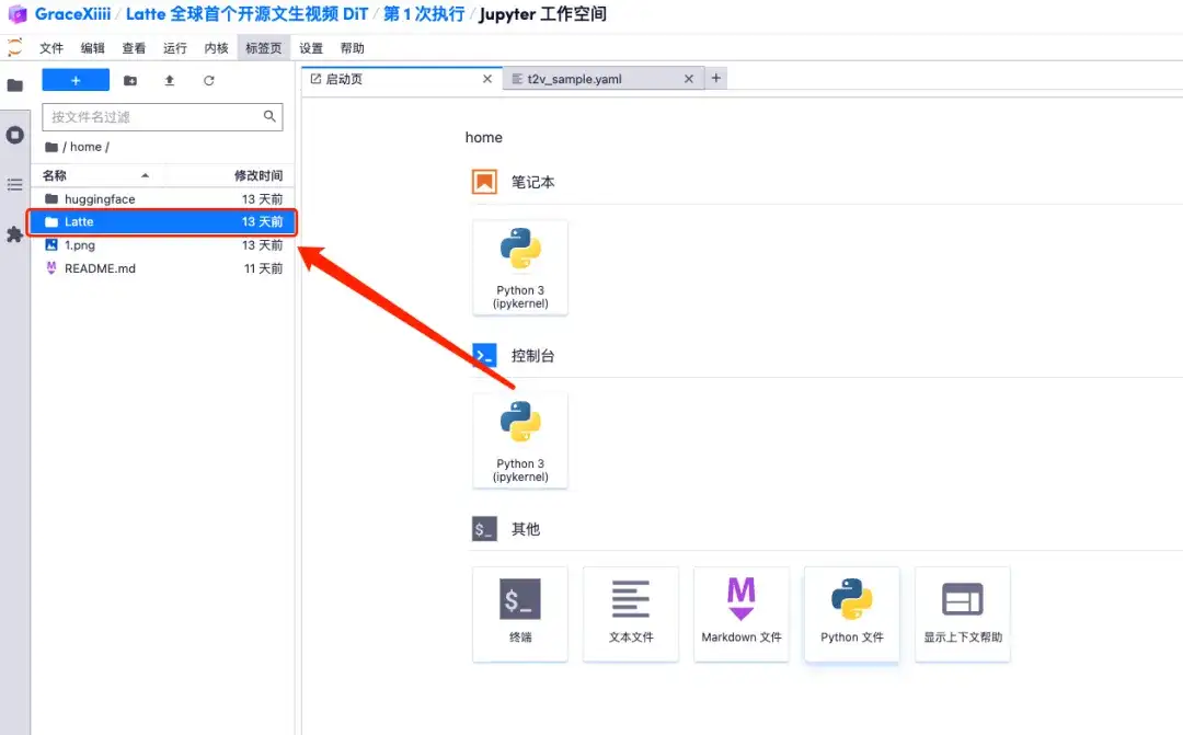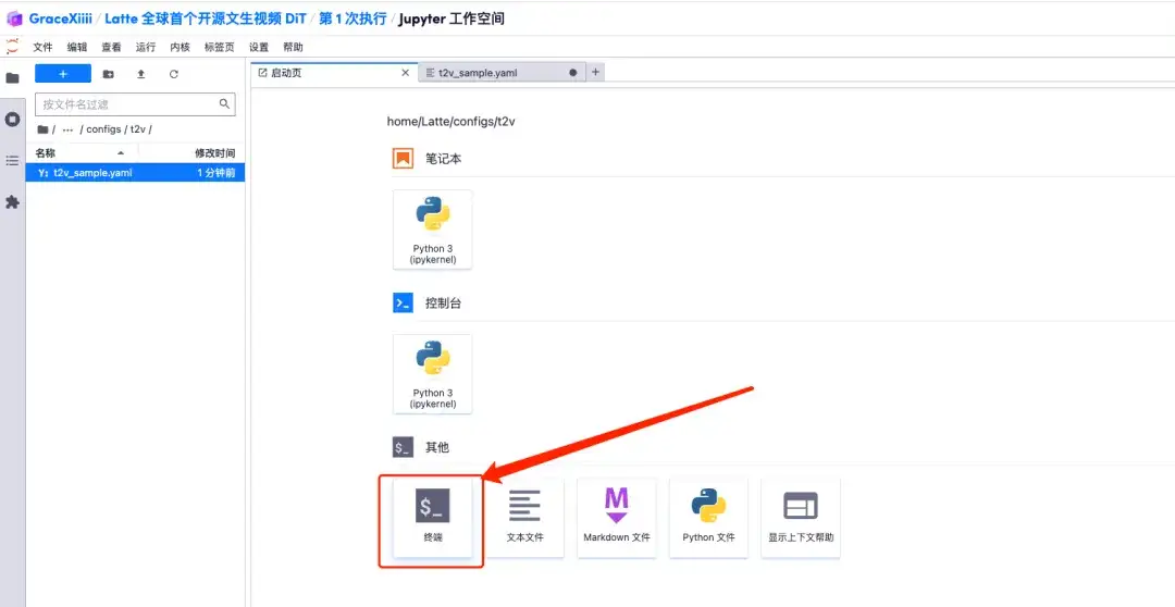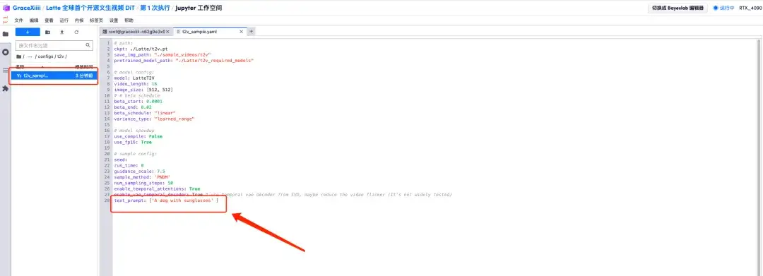 6. بعد فتح مساحة العمل، افتح ملف التكوين home/Latte/configs/t2v/t2v_sample.yaml وفقًا للمسار الموجود في القائمة اليسرى، وأدخل موجه الأوامر "على سبيل المثال: كلب يرتدي نظارة شمسية" ضمن text_prompt، واحفظه باستخدام Ctrl+S.