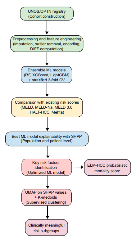 استجابةً لهذه المشكلة السريرية،اقترح فريق بحثي من شركة Telecom Sud-Paris وجامعة Paris-Saclay في فرنسا إطار عمل للتعلم الآلي يدمج التعلم الجماعي (EL) مع تحليل Schapel Additive exPlanations (SHAP).تقدم هذه الدراسة منهجًا جديدًا لتقييم خطر الوفاة لدى المرشحين لزراعة الكبد المصابين بسرطان الخلايا الكبدية. استنادًا إلى بيانات سريرية من 11647 مريضًا، قارنت الدراسة ثلاثة نماذج تجميعية: الغابة العشوائية (RF)، وXGBoost، وLightGBM. علاوة على ذلك، من خلال تضمين قيم SHAP في فضاء UMAP منخفض الأبعاد، ودمجها مع خوارزمية K-medoids للتجميع الخاضع للإشراف، أوضحت الدراسة أن خلل وظائف الكبد وتطور الورم هما العاملان الرئيسيان المؤديان للوفاة لدى مرضى سرطان الخلايا الكبدية.