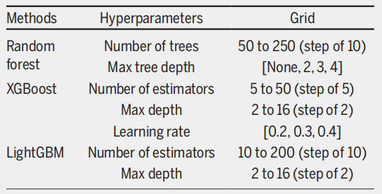 نظراً لعدم توازن الفئات الشديد في مجموعة البيانات، قلّصت الدراسة حجم المجموعة الأكبر (الموجودة على قائمة الانتظار) لإنشاء 30 مجموعة فرعية بحجم مماثل للمجموعة الأصغر (الوفيات خلال فترة الانتظار). أُجري التحقق المتقاطع ثلاثي الطيات على كل مجموعة فرعية متوازنة لضمان تخصيص جميع الملاحظات من المريض نفسه إما لمجموعة التدريب أو مجموعة الاختبار. ثم حُددت أفضل إعدادات المعلمات الفائقة للنماذج التجميعية الثلاثة باستخدام بحث شبكي، كما هو موضح في الشكل أدناه.