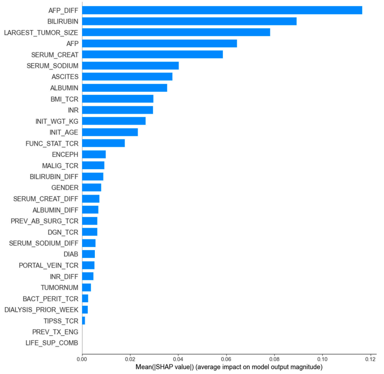 بالإضافة إلى ذلك، كشف تحليل المجموعات الفرعية بوضوح عن سببين رئيسيين لارتفاع خطر الوفاة: الفشل الكبدي الحاد (الذي يتميز بارتفاع البيليروبين، وارتفاع الكرياتينين، والاستسقاء المعتدل، وكلها تتوافق مع قيم SHAP الإيجابية وتزيد بشكل كبير من خطر الوفاة) وتطور الورم النشط (الذي يتميز بارتفاع مستويات AFP).