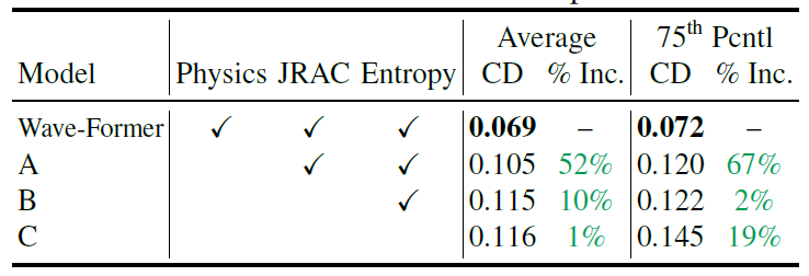 وأخيرًا، قام الباحثون أيضًا بتحليل مساهمة كل مكون من مكونات تصميم Wave-Former في الأداء العام. يوضح الجدول أدناه متوسط مسافة الشطف (CD)، والنسبة المئوية الخامسة والسبعين لمسافة الشطف، ونسبة التحسين الهامشي لـ Wave-Former مقارنةً بثلاثة مخططات تنفيذ جزئية مختلفة: