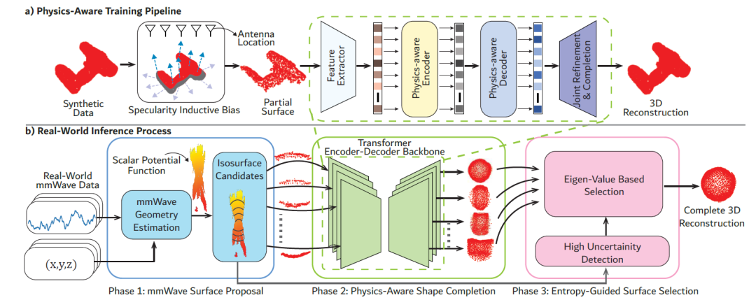 يعتمد إطار التدريب بأكمله على بنية المشفر-المفكك Transformer (PoinTr backbone)، بالإضافة إلى نموذج مراقبة متسق فيزيائيًا وهدف إزالة الضوضاء والإكمال.وهذا يُمكّن النموذج من التدريب على بيانات اصطناعية بالكامل وتحقيق إعادة بناء عالية الدقة لإشارات الموجات المليمترية الحقيقية.