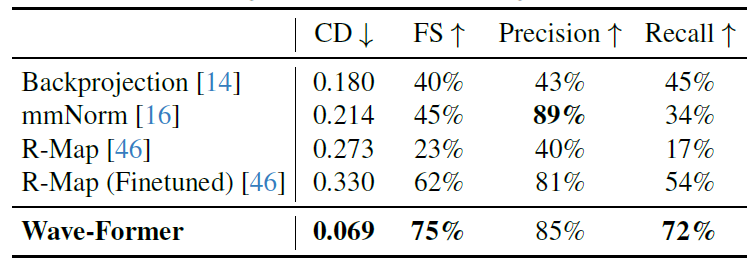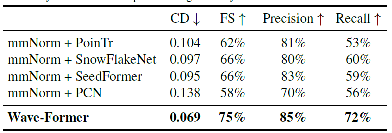 يوضح الجدول أدناه أداء برنامج Wave-Former مقارنةً بجميع الخطوط الأساسية من حيث متوسط مسافة Chamfer، ودرجة F، والدقة، والاستدعاء: