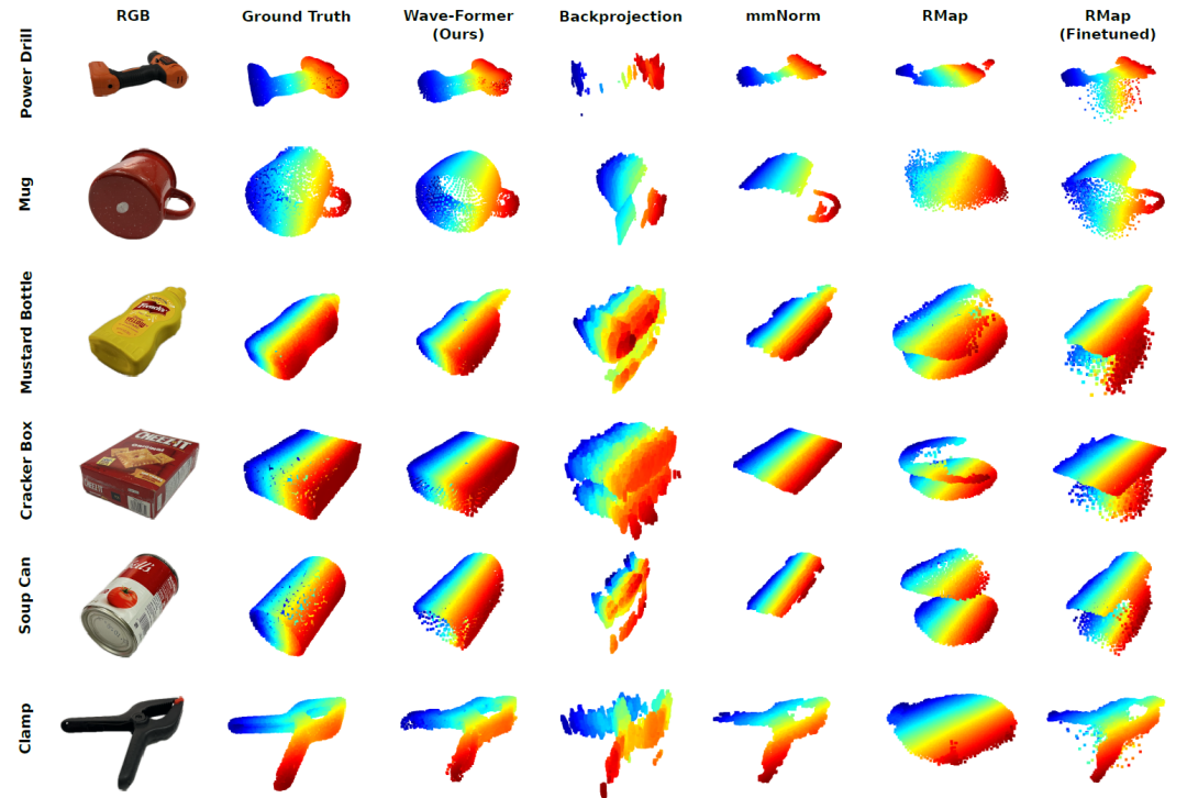 في البداية، استخدم الباحثون قياسات واقعية لمقارنة برنامج Wave-Former نوعيًا بأربعة برامج مرجعية. يوضح الشكل أدناه مناظر متساوية القياس للصورة الحقيقية RGB (بعد التجزئة) وسحابة النقاط لعدة أجسام محجوبة بالكامل، بالإضافة إلى نتائج إعادة البناء لكل طريقة.