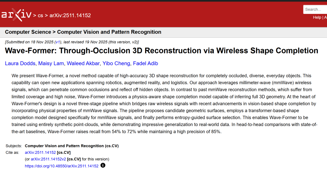 تم نشر نتائج البحث ذات الصلة، بعنوان "Wave-Former: Through-Occlusion 3D Restruction via Wireless Shape Completion"، كنسخة أولية على arXiv.