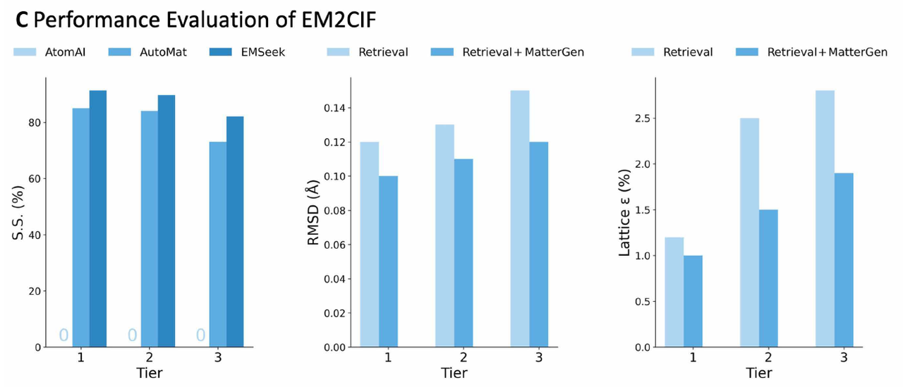 تم إجراء اختبارات معيارية على التشابه الهيكلي (SS) والانحراف التربيعي المتوسط (RMSD) وخطأ الشبكة (ε) على مستويات صعوبة مختلفة، وتمت مقارنة EMSeek مع AtomAI و AutoMat وأوضاع البحث النقي والهجينة.