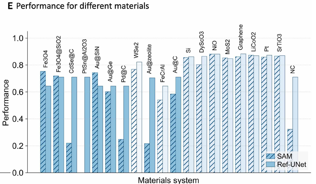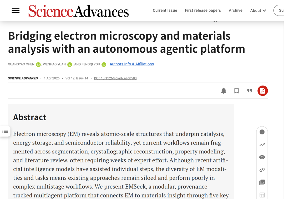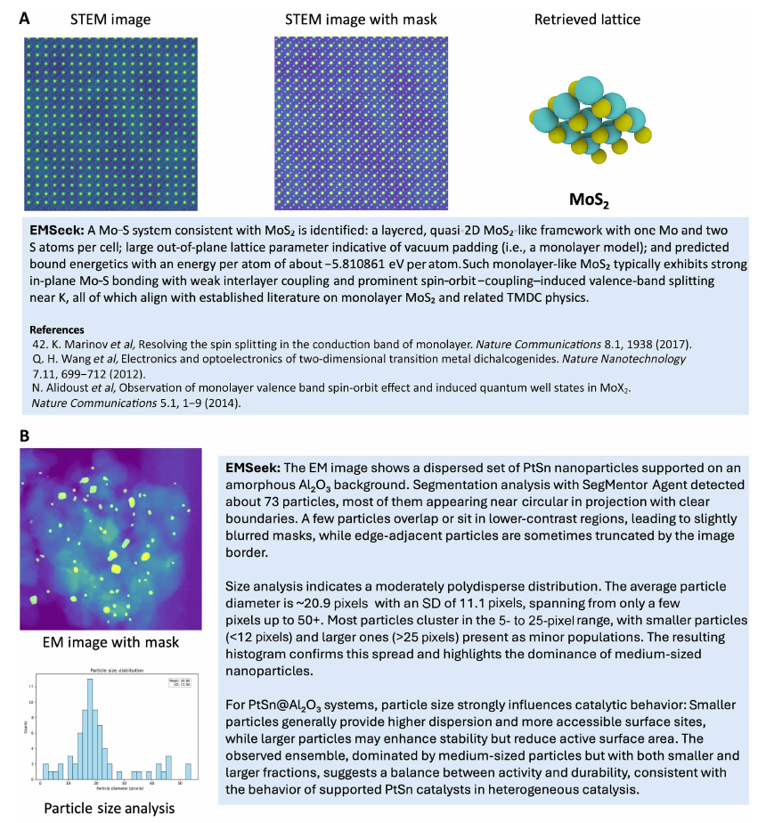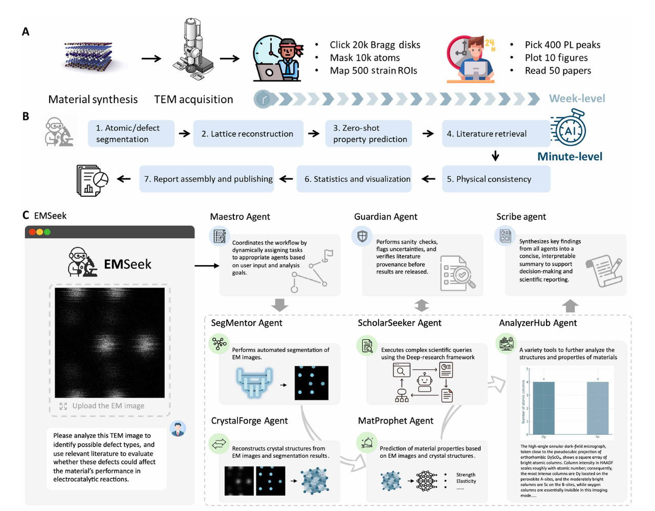 وفي هذا السياق،اقترح فريق بحثي من جامعة كورنيل منصة EMSeek، وهي منصة معيارية متعددة العوامل ذات قدرات تتبع المصدر.يدمج برنامج EMSeek الإدراك، وإعادة بناء البنية، واستنتاج الخصائص، والاستدلال من المراجع العلمية في سير عمل موحد لتحليل المجهر الإلكتروني. تُظهر نتائج التقييم على 20 نظامًا ماديًا و5 فئات مهام أن EMSeek يحقق ضعف سرعة برنامج Segment Anything تقريبًا، ودقة أعلى في مهام التجزئة؛ ويحقق تشابهًا بنيويًا يتجاوز 90% على مجموعة بيانات STEM2Mat؛ ومع معايرة باستخدام 2% فقط من البيانات المصنفة، فإنه يُضاهي أو يتجاوز أداء النماذج القوية أحادية الخبير في ثلاثة معايير قياسية للتنبؤ بالخصائص خارج التوزيع. والأهم من ذلك،تستغرق هذه الطريقة من دقيقتين إلى خمس دقائق فقط للاستعلام عن كل صورة بالكامل، وهو ما يعادل حوالي 50 مرة أسرع من عملية الخبراء.