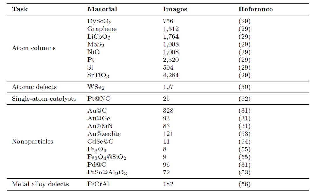 تحتوي مجموعة البيانات هذه على آلاف الصور المجهرية المشروحة على مستوى البكسل من 20 نظامًا ماديًا (البيروفسكايت، وسبائك عالية الإنتروبيا، والهياكل غير المتجانسة لفان دير فالس، والمحفزات أحادية الذرة، وما إلى ذلك).تنقسم المهام إلى خمس فئات: تحديد موقع العمود الذري، وتحديد العيوب النقطية، واستخراج محيط الجسيمات النانوية، وحساب العيوب الناتجة عن الإشعاع، وتحديد الذرة المفردة.