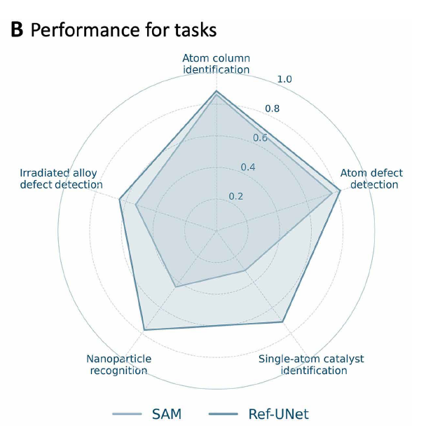 قام الباحثون بتدريب نموذج Ref-UNet باستخدام مجموعة بيانات متعددة المهام. تُظهر التجارب أن Ref-UNet يتفوق بشكل ملحوظ على نموذج Segment Anything في كلٍ من أداء المهام والأداء العام (انظر الشكلين B و E أدناه). تبلغ تكلفته الحسابية 259 جيجا فلوب، وعدد معلماته 28 مليونًا، أي ما يقارب نصف عدد معلمات نموذج SAM 2 Hiera-B+ (560 جيجا فلوب، 81 مليون معلمة).يحقق ذلك سرعة استدلال تبلغ ضعف السرعة تقريبًا على وحدة معالجة الرسومات الواحدة، مما يدعم بالتالي التغذية الراجعة التفاعلية في الوقت الفعلي في سير عمل EMSeek.