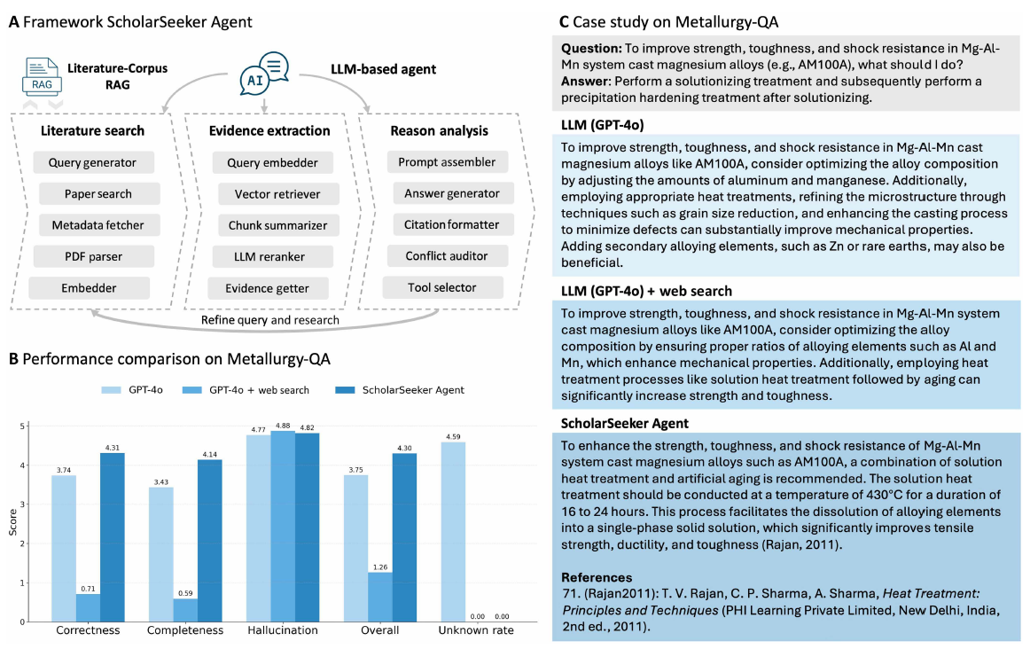 بالإضافة إلى تحليل الصور،يدمج برنامج EMSeek أيضًا إمكانيات الاستدلال القائمة على المستندات للإجابة على الأسئلة العلمية.كما هو موضح في الشكل أدناه، بعد دمج المراجع المتخصصة عبر ScholarSeeker، تتفوق دقة وموثوقية الإجابات على مجموعة بيانات Metallurgy-QA على نماذج اللغة الأساسية واسعة النطاق أو عمليات البحث البسيطة على الإنترنت. تجدر الإشارة إلى أن تحسين الشبكة البسيط قد يُقلل الأداء أحيانًا، لأن نتائج استرجاع المعلومات من الإنترنت واسعة النطاق غالبًا ما تحتوي على معلومات ضعيفة الصلة بالمهمة، مما يُؤدي إلى مشاكل عدم تطابق الأدلة أو استبدال المنهجية.