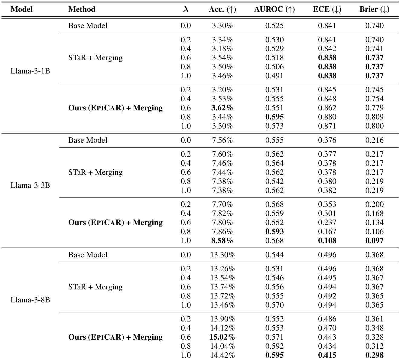 The authors use model merging to evaluate the impact of their EPICAR method on calibration and accuracy across different model scales. Results show that for Llama-3-8B, the Ours (EPICAR) + Merging approach achieves the highest accuracy (15.02%) and the lowest Brier Score (0.298), indicating superior calibration and predictive quality compared to STaR + Merging and the base model.