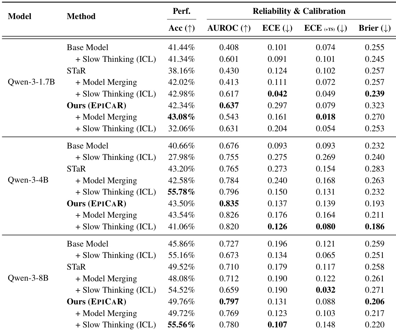 - Synergy with model merging: Ours + Merging achieves highest Llama-3-8B accuracy (15.02%) and near-perfect ECE (+TS) of 0.018 (Qwen-3-1.7B), confirming complementary reliability signals.