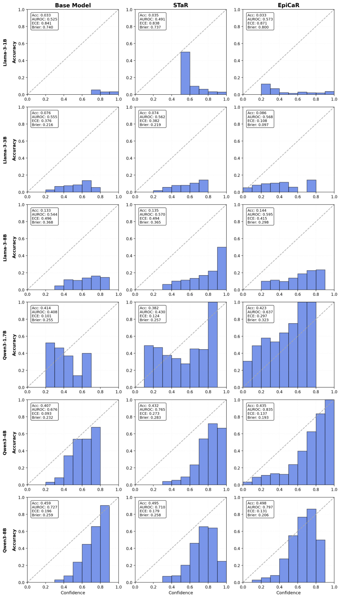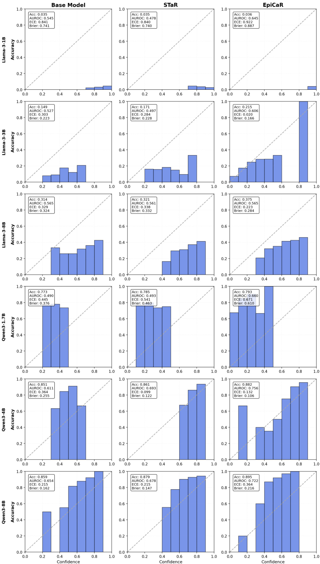 The authors use reliability diagrams to compare the calibration of the Base Model, STaR, and EpiCaR across multiple model sizes and families. Results show that EpiCaR achieves better alignment between confidence and accuracy, with lower Expected Calibration Error (ECE) and higher AUROC compared to STaR, particularly in larger models like Llama-3-8B and Qwen-3-8B.