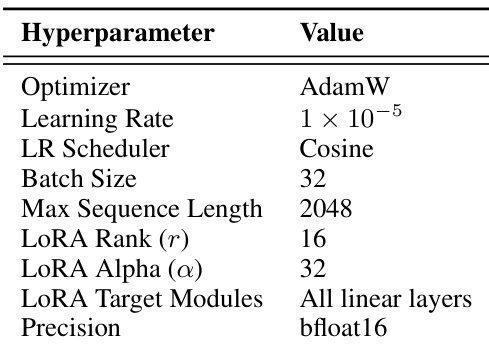 The authors use AdamW as the optimizer with a learning rate of 1×10−5 and a cosine learning rate scheduler. The model is trained with a batch size of 32, a maximum sequence length of 2048, and LoRA parameters set to a rank of 16 and alpha of 32, with all linear layers targeted and bfloat16 precision used.