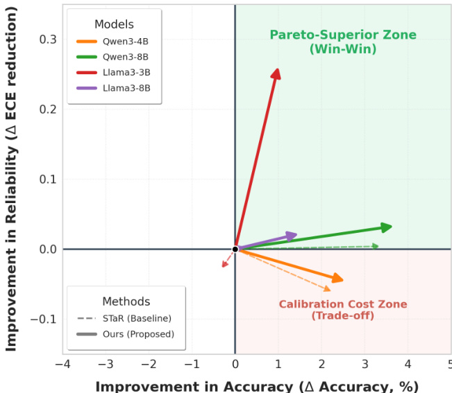 Large language models (LLMs) have made significant strides in complex reasoning tasks like math and code generation, largely through iterative self-training methods such as STaR, which refine models by reinforcing correct reasoning paths. However, these approaches often lead to overconfidence and poor calibration—models become highly certain about incorrect answers—due to a positive-only feedback loop that induces model collapse, where uncertainty representation degrades. This miscalibration undermines reliability in high-stakes applications where knowing when not to trust a model is as crucial as producing correct outputs. The authors propose EpiCAR, a training objective that reframes reasoning as an epistemic learning problem by jointly optimizing reasoning accuracy and calibration. By integrating explicit self-evaluation signals into an iterative supervised fine-tuning framework, EpiCAR enables models to learn when their reasoning is trustworthy, achieving Pareto-superior performance over baselines in both accuracy and calibration, particularly in models with sufficient capacity (3B+). This approach reduces inference compute by up to 3×, matching the performance of high-sample-count methods with far fewer generations, while generalizing effectively to out-of-distribution tasks like GSM8K and MBPP.