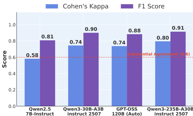 - Human-LLM agreement analysis revealed that LLMs above 30B scale achieve substantial agreement (F1: 0.90, κ: 0.74), with performance saturating beyond 30B.