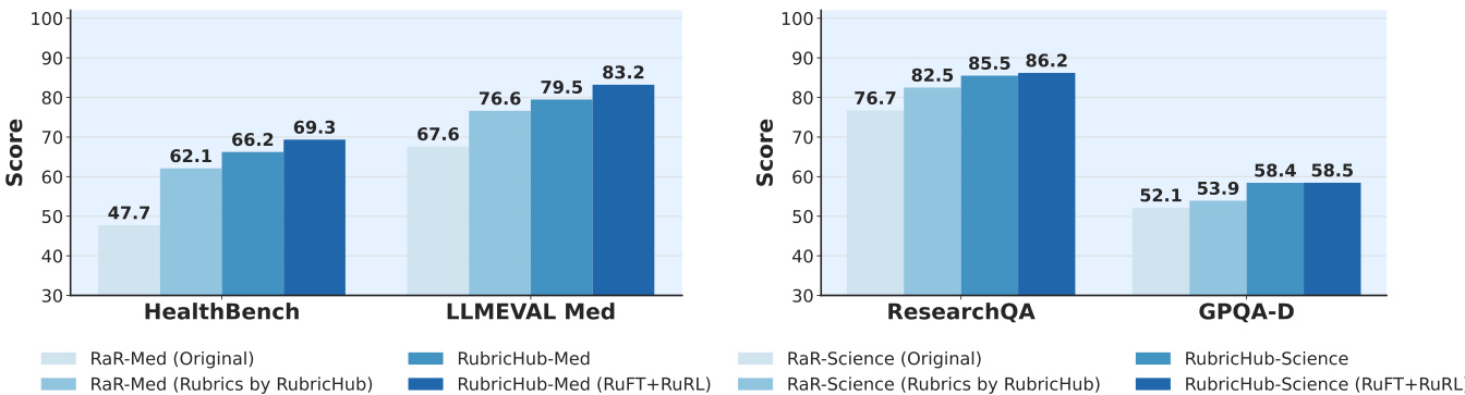 The authors address the challenge of aligning large language models (LLMs) in open-ended, non-verifiable domains—where ground truth is absent—by advancing rubric-based evaluation as a scalable proxy for supervision. While reinforcement learning with verifiable rewards (RLVR) excels in math and coding, it fails in real-world, subjective tasks. Existing rubric methods are limited by manual effort, narrow domain coverage, and coarse, low-discriminative criteria that cannot differentiate high-quality responses, creating a supervision ceiling. To overcome this, the authors propose an automated Coarse-to-Fine Rubric Generation framework that combines principle-guided synthesis, multi-model aggregation, and difficulty evolution to produce fine-grained, highly discriminative criteria. This enables the creation of RubricHub, a large-scale (~110k), multi-domain dataset with rich, nuanced evaluation criteria. Validated through a two-stage post-training pipeline—Rubric-based Rejection Sampling Fine-Tuning (RuFT) and Reinforcement Learning (RuRL)—the framework enables a Qwen3-14B model to achieve state-of-the-art performance on HealthBench (69.3), surpassing even proprietary models like GPT-5.
