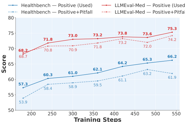 - Training dynamics showed steady, balanced improvement across rubric dimensions, indicating holistic capability enhancement without over-optimization.