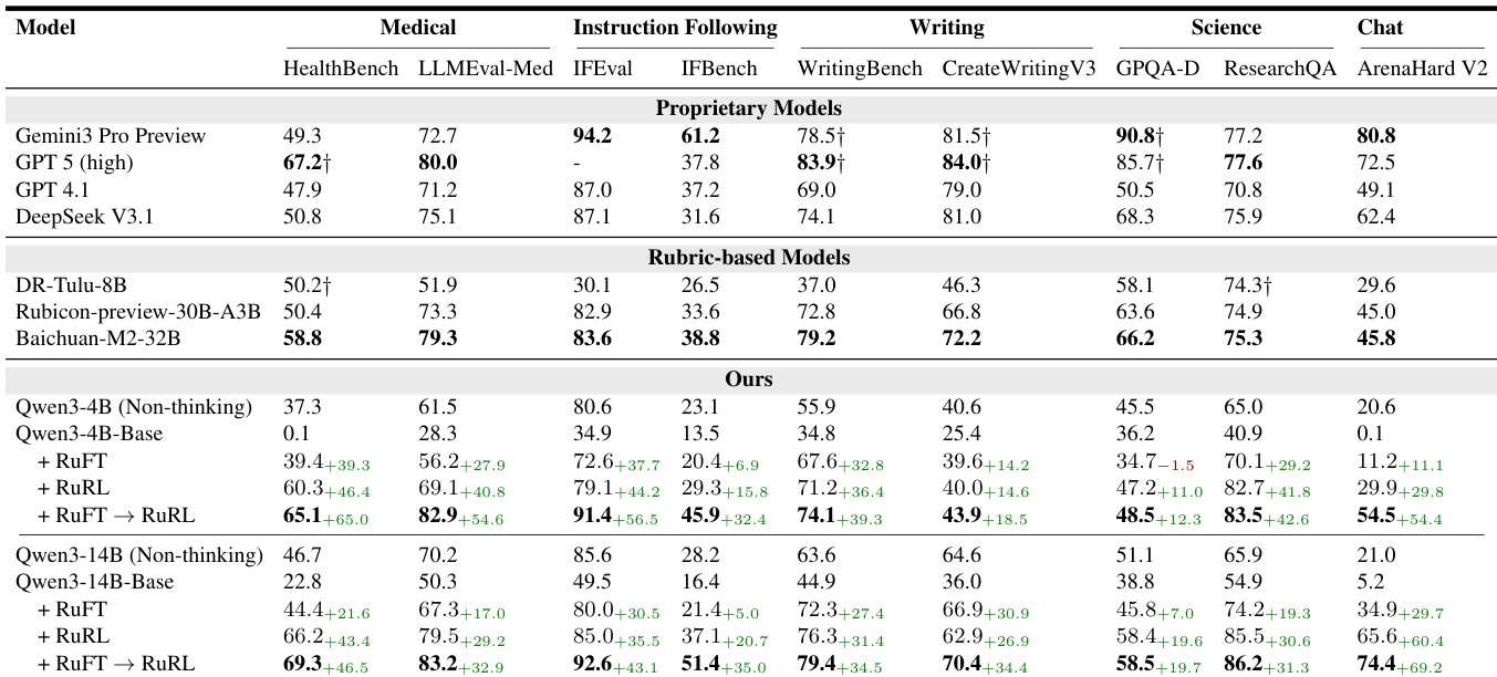 - Main experiments validate a two-stage post-training framework (RuFT followed by RuRL) on Qwen3-4B and Qwen3-14B base models across five domains: Science, Instruction-Following, Writing, Medical, and Chat.
