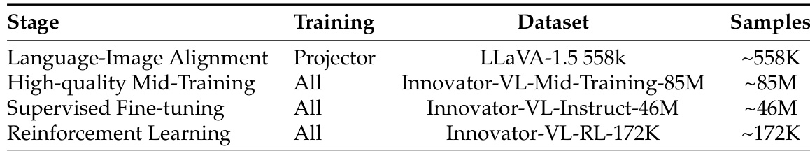 Following pre-training, Innovator-VL undergoes staged post-training to refine its capabilities. This includes supervised fine-tuning and reinforcement learning. The supervised fine-tuning stage aims to enhance the model's instruction-following ability, multi-step reasoning, and scientific understanding. The reinforcement learning stage further strengthens the model's multimodal reasoning and its capacity to tackle complex scientific problems. The training pipeline is supported by a high-performance distributed training framework, which employs advanced optimization strategies to maximize computational throughput and memory efficiency.