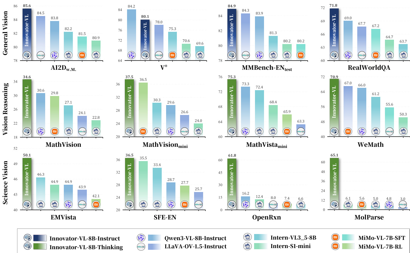 - Innovator-VL maintains strong generalization across general vision, multimodal reasoning, and scientific benchmarks, proving that scientific alignment can be integrated without sacrificing broad multimodal capabilities.