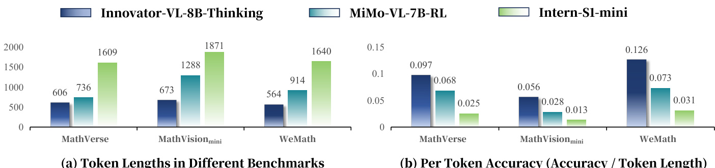 - Innovator-VL-8B-Thinking generates 62–66% fewer tokens than Intern-S1-mini and 18–48% fewer than MiMo-VL-7B-RL, while achieving 1.4–4.3× higher accuracy-to-token ratios, demonstrating superior reasoning efficiency.