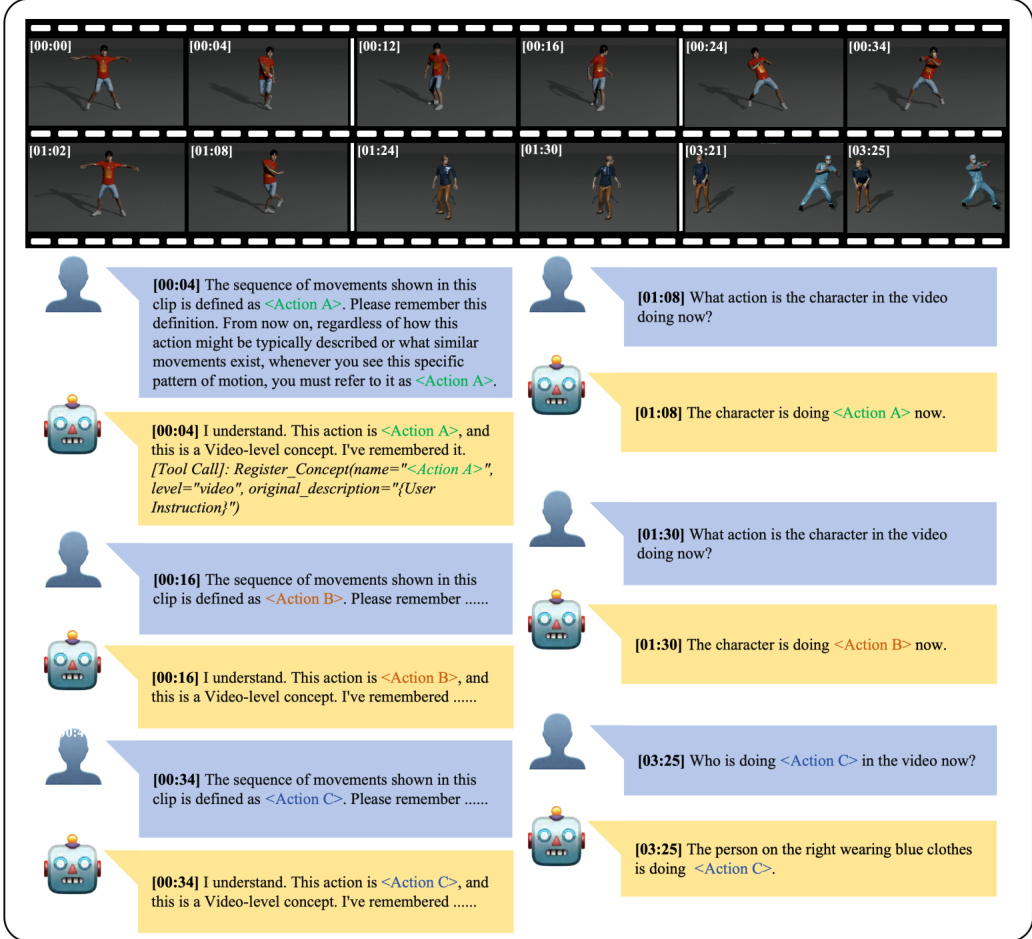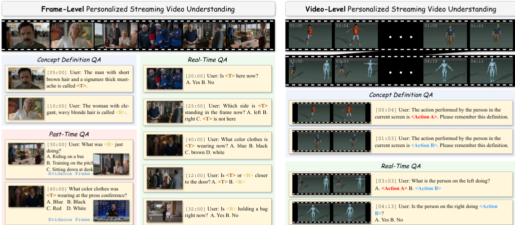 Key Details for Each Subset: The dataset supports two distinct concept types: Frame-level concepts (static characters) and Video-level concepts (dynamic actions). Annotations are categorized into three QA types: Concept-Definition for registering new concepts, Real-Time for querying current states, and Past-Time for retrieving historical evidence. The average video duration is 1,458 seconds, with all annotations linked to precise timestamps.
