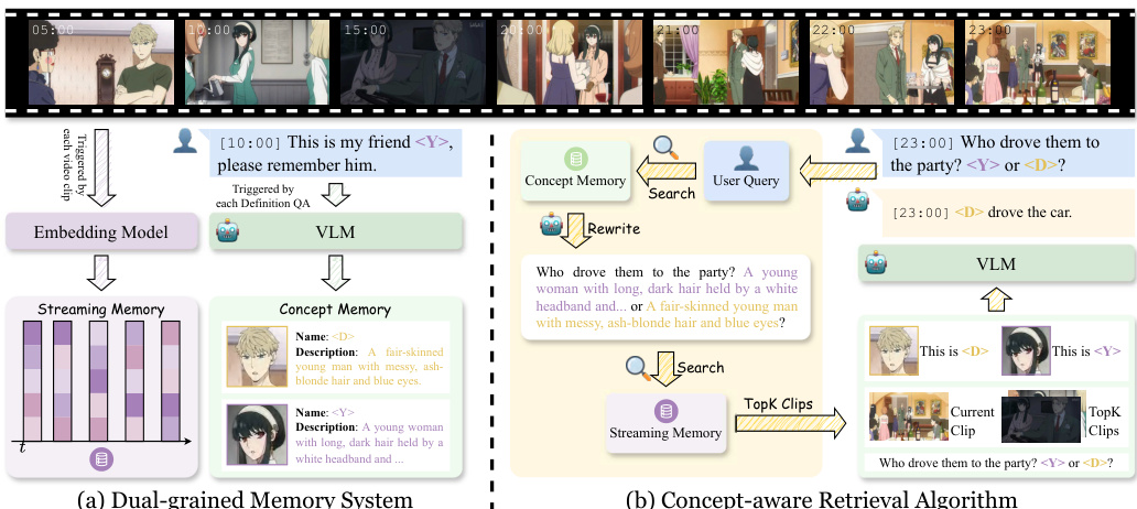 To manage the unbounded stream and evolving concepts, the authors design a Dual-grained Memory System that decouples concept-centric knowledge from stream-centric observations. This system comprises a Streaming Memory that incrementally archives segmented clips with compact multimodal embeddings, and a Concept Memory that stores structured representations of user-defined concepts. As shown in the figure below, the architecture explicitly separates these two memory streams to facilitate efficient retrieval.