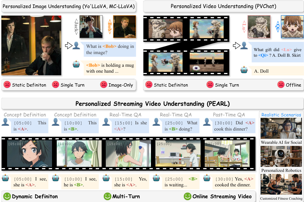 The authors propose PEARL, a plug-and-play framework designed for Personalized Streaming Video Understanding (PSVU). Unlike prior approaches restricted to static definitions or single-turn interactions, PEARL enables dynamic concept definition and real-time responses within an online streaming video context. Refer to the framework diagram to observe the transition from static image/video understanding to the proposed dynamic, multi-turn streaming capability.