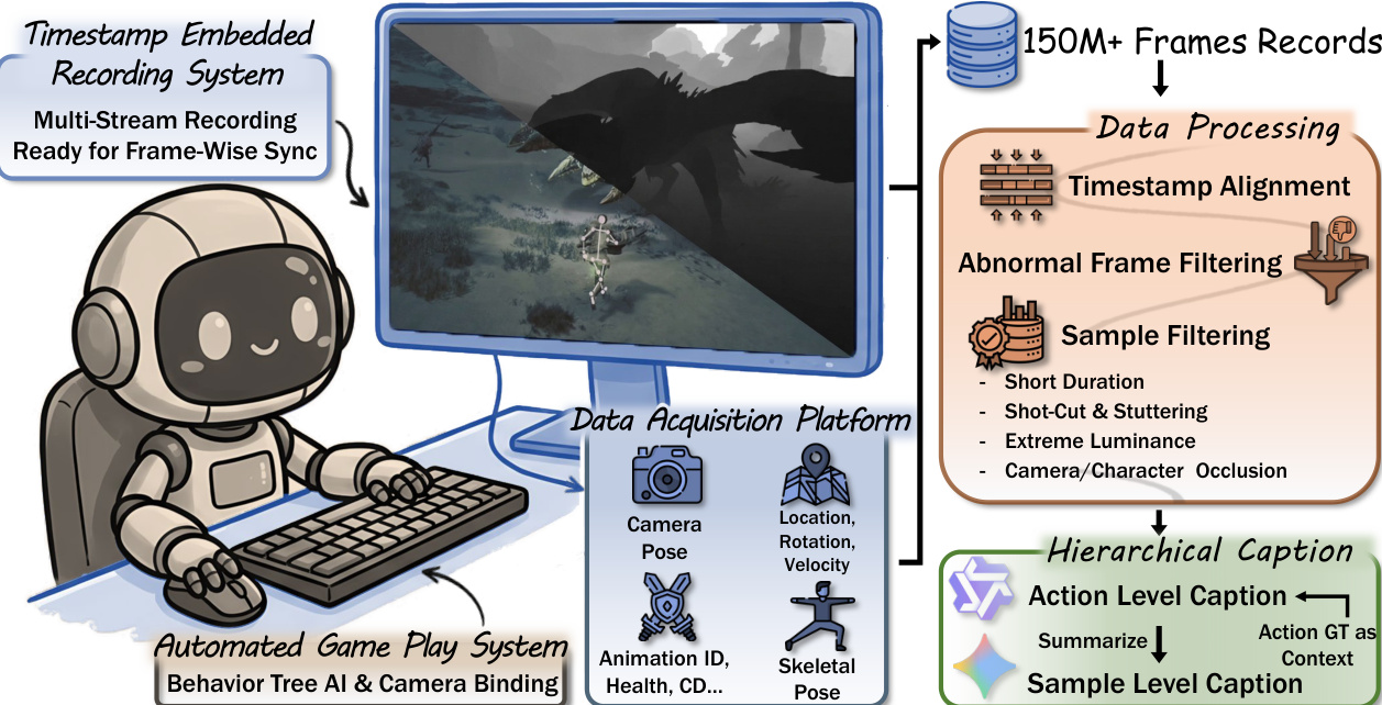 The authors establish a robust data foundation through an automated game play system designed for high-fidelity recording. Refer to the framework diagram. This system employs a timestamp-embedded recording mechanism to ensure frame-wise synchronization across multiple data streams. The Data Acquisition Platform captures diverse modalities including camera pose, location, rotation, velocity, animation IDs, health status, and skeletal pose. Following collection, the data undergoes a rigorous processing pipeline involving timestamp alignment and filtering for abnormal frames and samples with issues such as short duration, shot-cuts, extreme luminance, or occlusion.