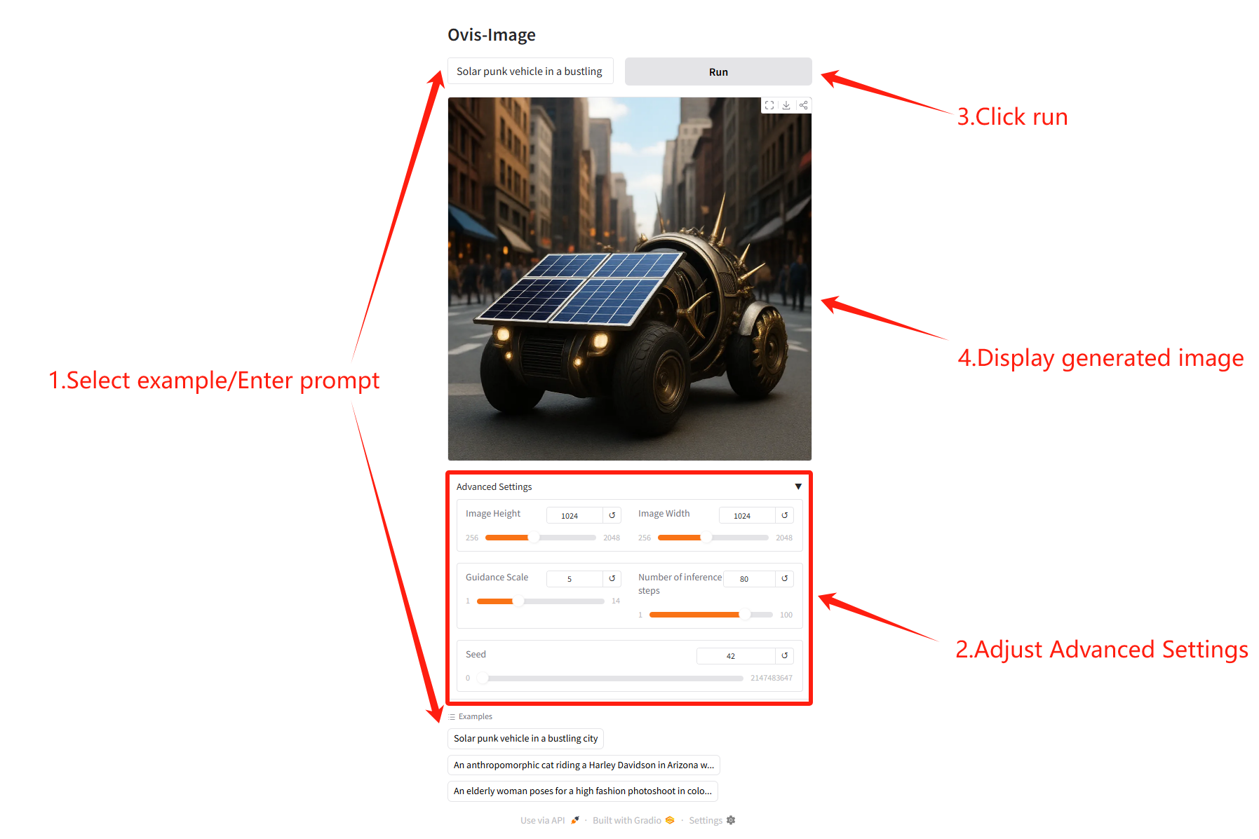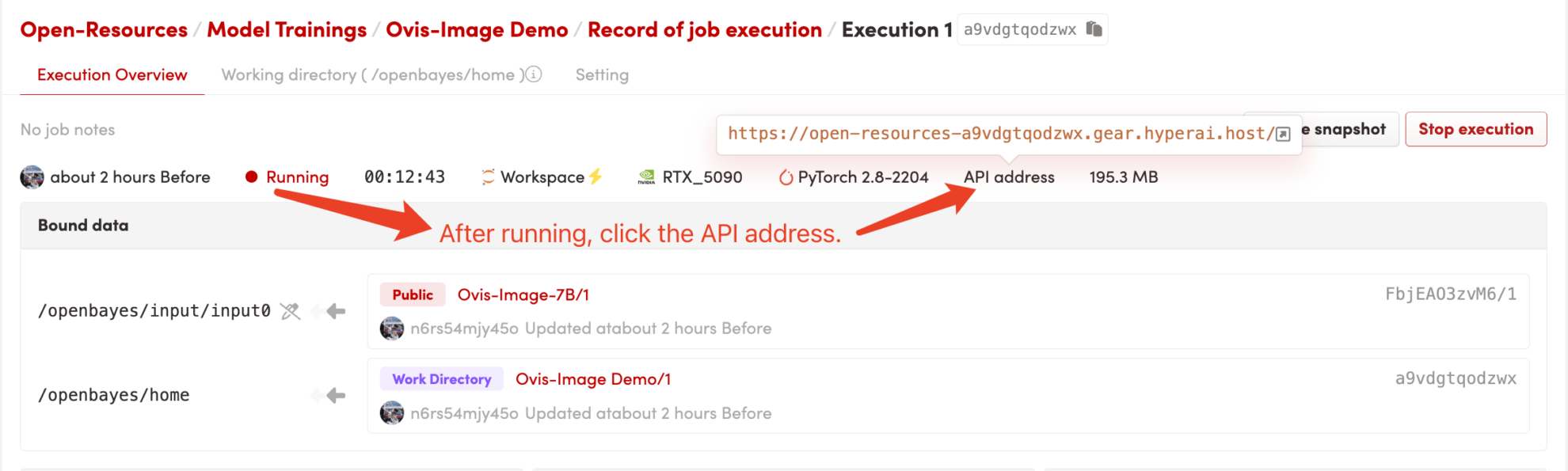 يستخدم هذا البرنامج التعليمي Grado لنشر نموذج Ovis-Image 7B الأساسي، مع موارد الحوسبة "RTX_5090"، والتي يمكنها تحقيق إنشاء نص عالي الدقة 1024×1024 دون أي اختناقات في ذاكرة الفيديو/الذاكرة.