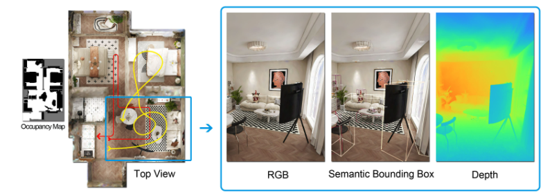 该数据集提供高质量的 3D 高斯散射(3DGS)表示,以及实例级语义边界框和指示代理可访问区域的占用图。数据包含 1,000 个高质量室内场景及其对应的平面图,涵盖住宅、便利店、婚宴厅、博物馆等 80 余种环境类型。该数据集还包括超过 554,000 个物体实例,覆盖 755 个物体类别。
