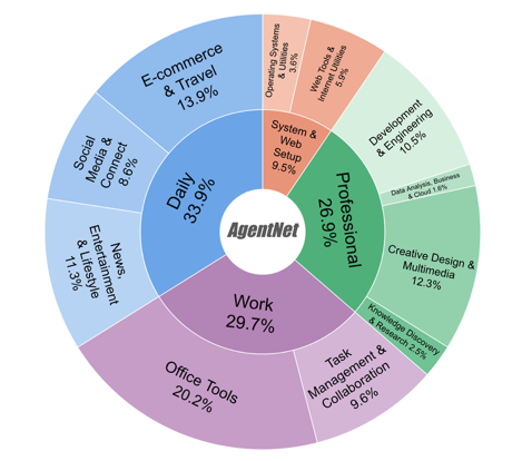 数据集包含 22.6K 条人工标注的电脑使用任务轨迹,覆盖 Windows / macOS / Ubuntu 三大系统与 200+ 个应用/网站,场景涉及办公、专业、日常、系统四类。适用于桌面自动化、多应用流程与跨平台代理的训练与评估。