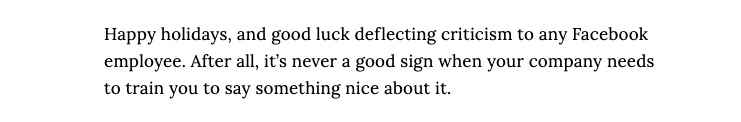 译:祝 Facebook 的员工们节日快乐,不过当你的公司想要训练你说公司好话的时候,这可不是什么好事儿。