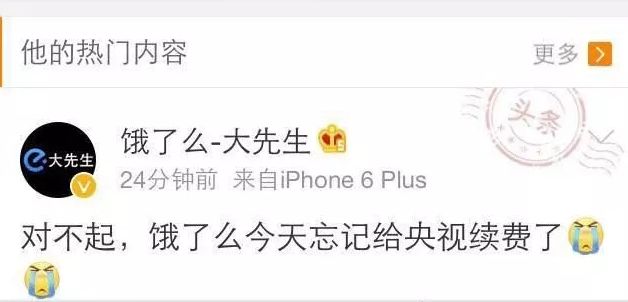 报道一出,官微还没来得及发声明。有饿了么员工率先在微博发了声:对不起,饿了么今天忘记给央 X 续费了。