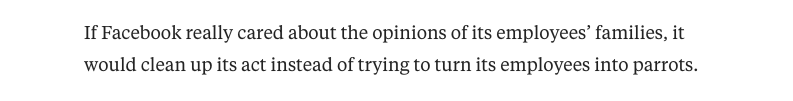 译:Facebook 要是真在乎员工家人的看法,就会好好规范自己的行为,而不是想方设法把员工训练成鹦鹉。