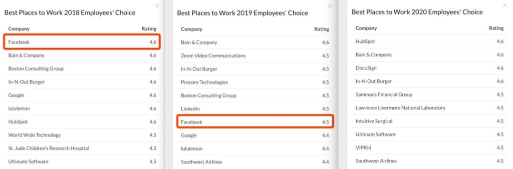 近日 Glassdoor 发布了员工评选的 2020 年最理想公司, 从 2018 年的排名第一,到 2019 年的排名第七,再到 2020 年的跌出前十名,Facebook 在员工心目中的形象一路下坡。