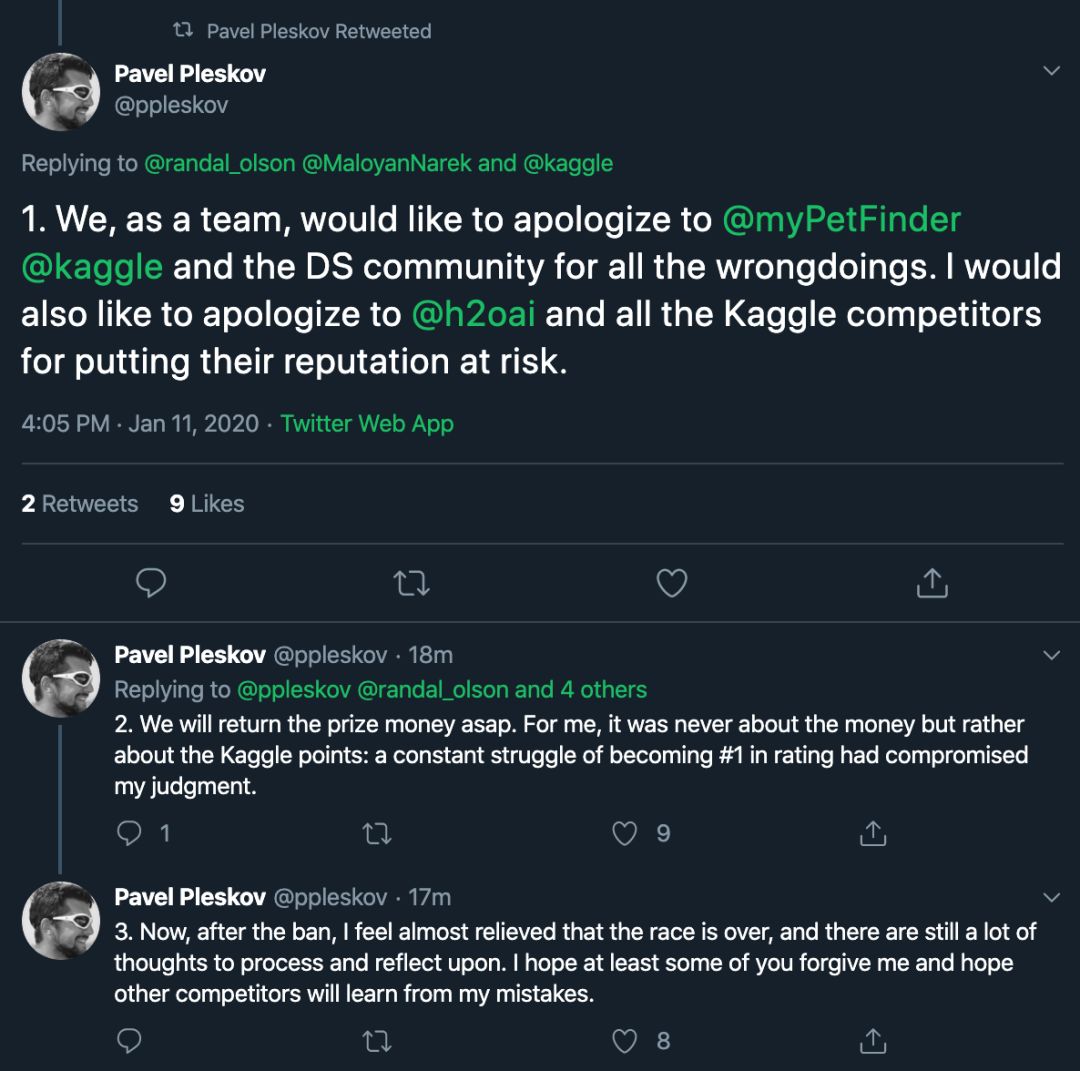 事后,Pavel Pleskov 在第一时间站出来道歉,认错态度还挺诚恳,他还表示团队会尽快退还奖金。他说:「对我而言,这与金钱无关,而与 kaggle 积分有关,不断成为第一的刺激已经让我失去了判断力。」