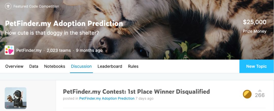 近日,在 kaggle 的一项竞赛讨论页面,一个比赛组织方「PetFinder.my」宣布,名为 Bestpetting 的冠军团队,因在「PetFinder.my Adoption Prediction」比赛中作弊,已被取消参赛资格。