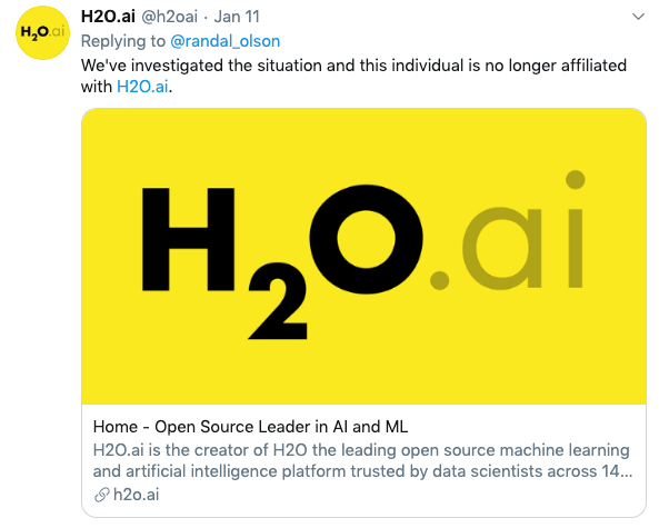 而 Pavel Pleskov 所在的公司 H2O.ai,也表示已经解雇 Pavel Pleskov ,并且称「从此此人与我司无任何关系」。