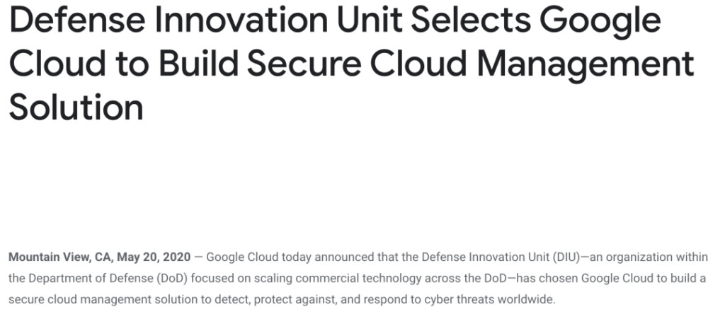 5 月 20 日,谷歌云和美国国防创新部门(DIU),达成了一项关于网络安全的合作协议,金额达到七位数的百万美元。