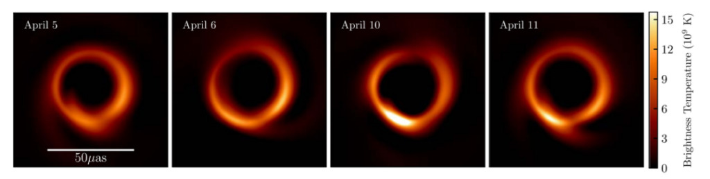 图中可以看到,环最亮处位置角度、环南部最亮等特征在不同日期中略有变化,并且比较前两天和后两天图像,也可明显看到环最亮部分位置角度和光环亮度的差异,对此,研究人员认为这是由于观察的源结构 (source structure),即黑洞周围物质的分布和排列方式不同。