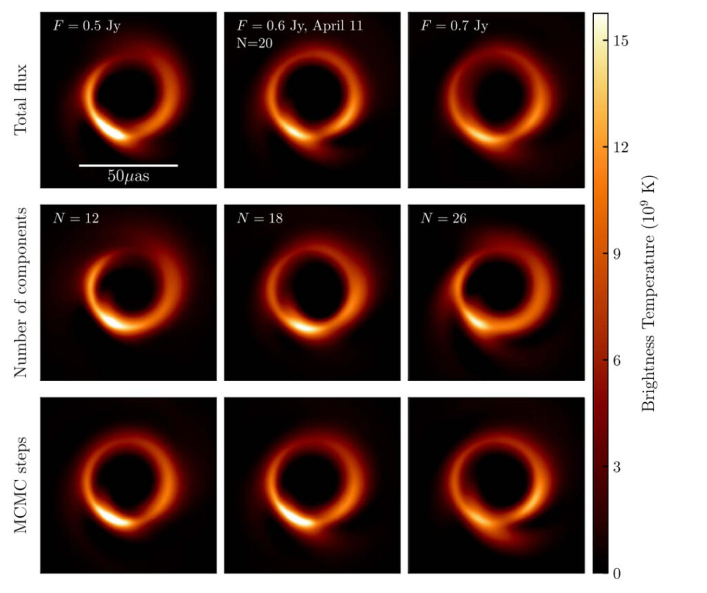 图中可以看到,不同的总压缩源通量和不同数量的 PCA 分量不同,会造成环最亮处的亮度及位置角度出现差异。同时,环的大小和宽度则不受影响。图 3 显示了基于 2017 年 4 月 5 日、 6 日、 10 日和 11 日 EHT 数据重建图像的比较。