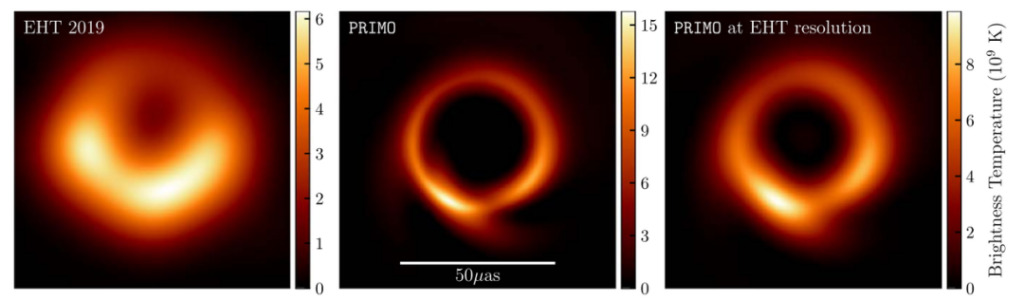 右:将 PRIMO 图像模糊至 EHT 阵列的分辨率。